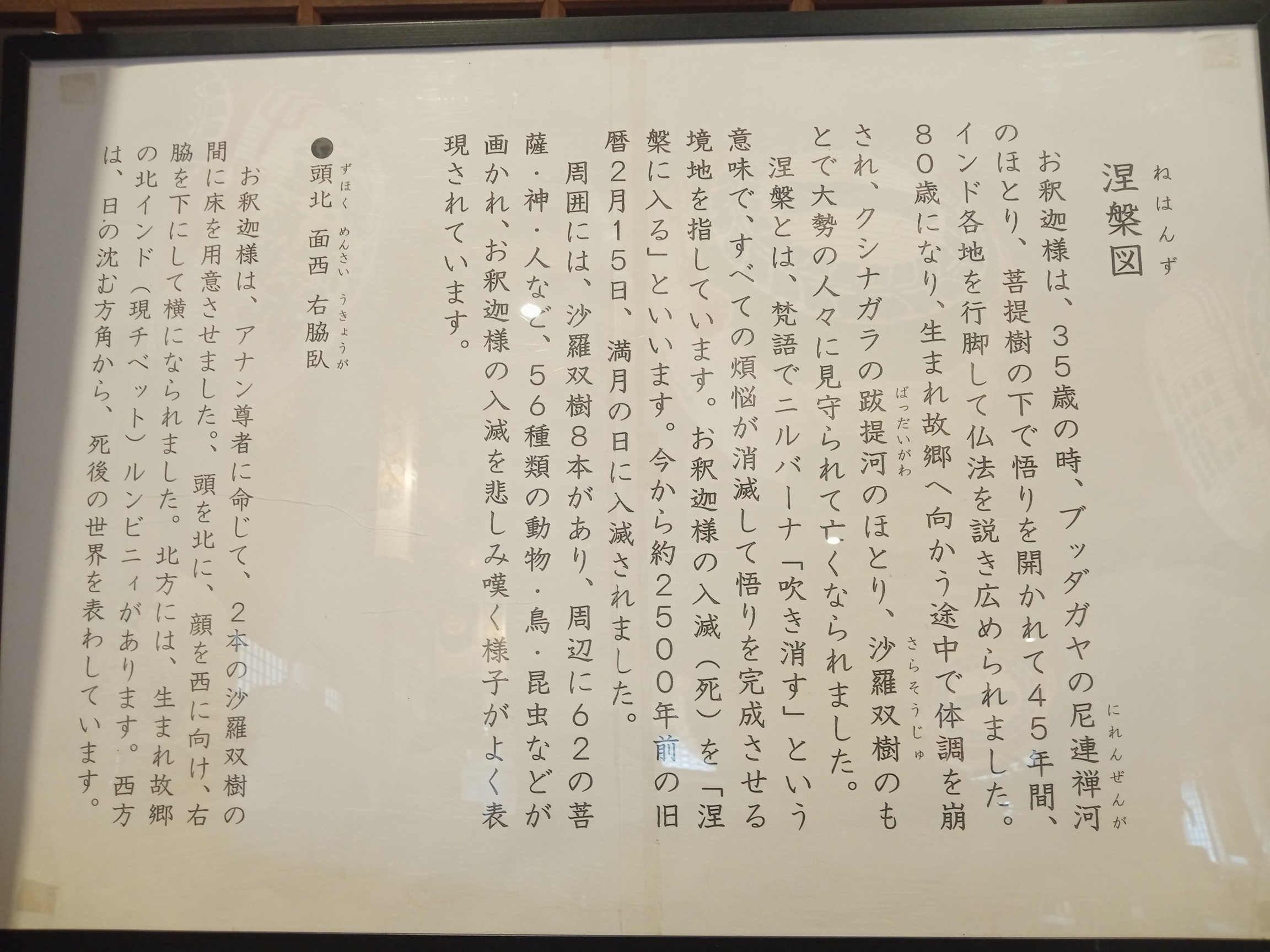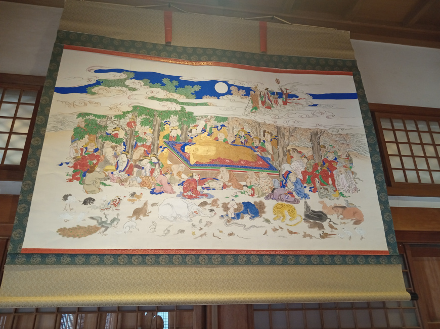 右上の雲に乗っている方は、お釈迦様のお母さま摩耶夫人で、お釈迦様の入滅を聞いて霊薬を薬袋に入れてかけつけましたが、薬袋は沙羅双樹の木に引っ掛かり結局は届かなかった。